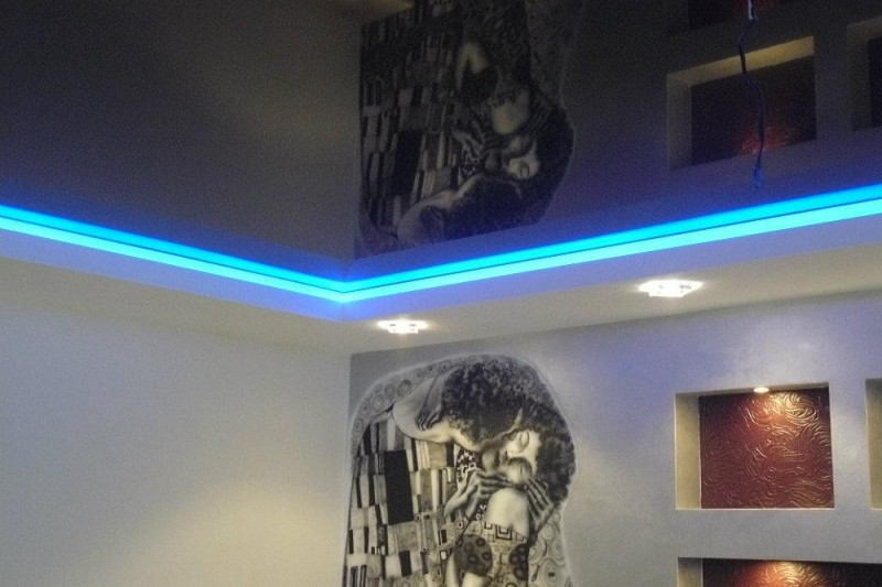 Рекомендуем посмотреть фото наших готовых работ. Среди них есть наверняка те, что вас вдохновят. Главное условие, лампа не должна нагревать полотно. В остальном выбирайте любую систему освещения.