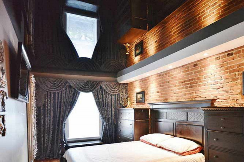 Материал в таком цвете зеркалит не только источники света, но и предметы, что создает ощущение второго этажа в комнате.