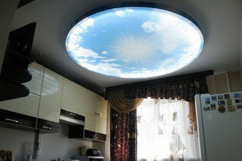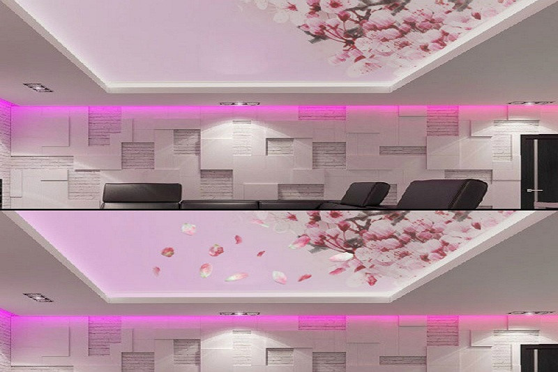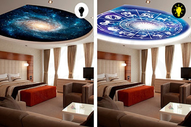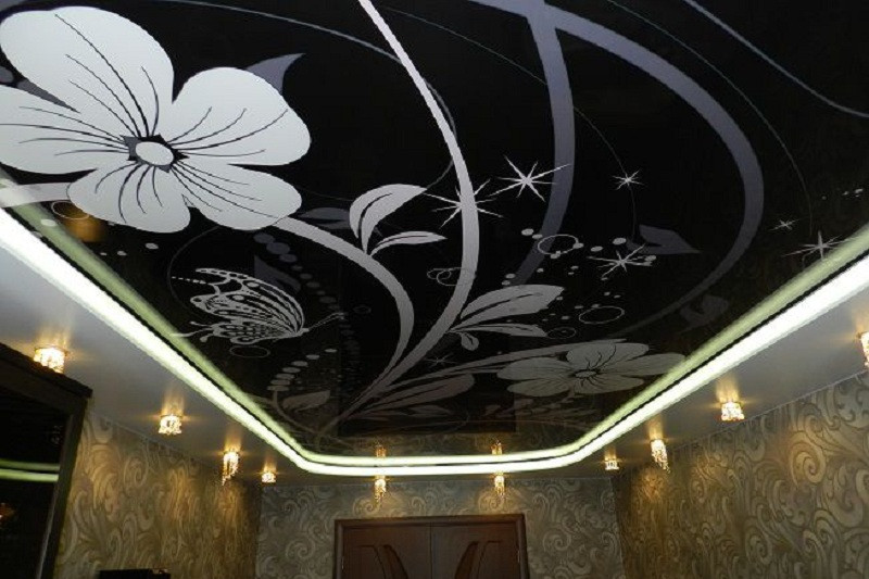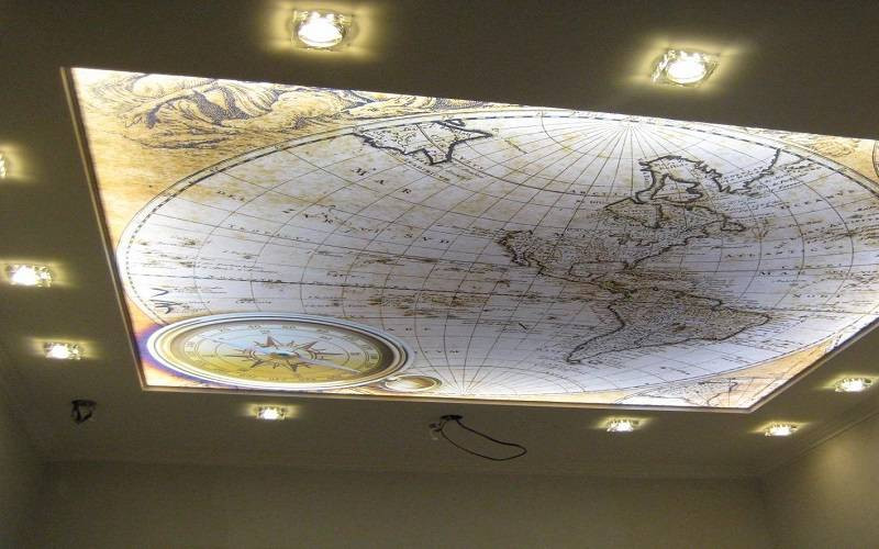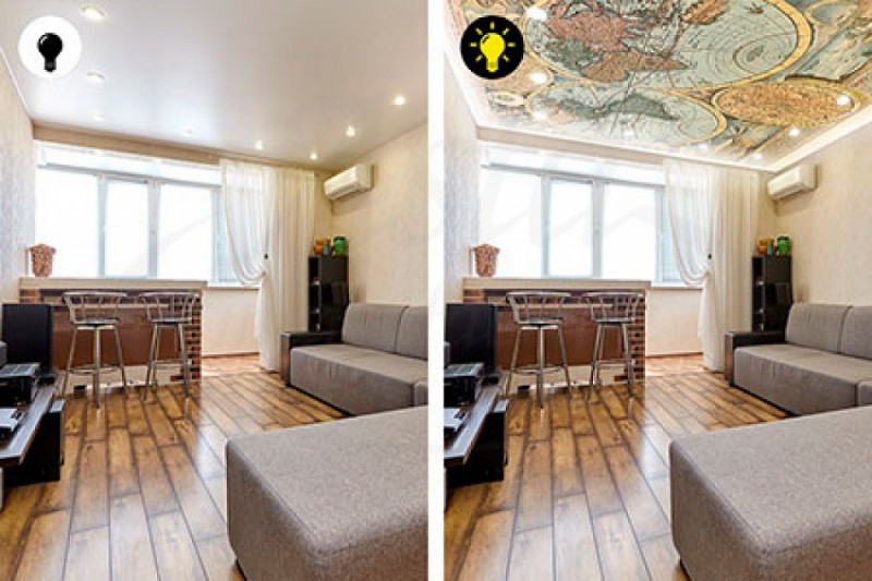 Рекомендуем посмотреть фото наших готовых работ. Среди них есть наверняка те, что вас вдохновят. Главное условие, лампа не должна нагревать полотно. В остальном выбирайте любую систему освещения.