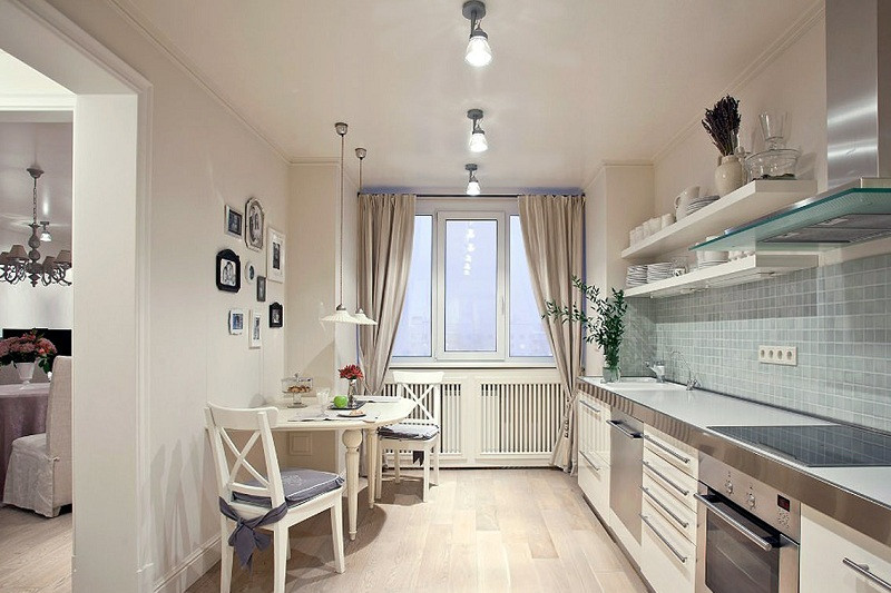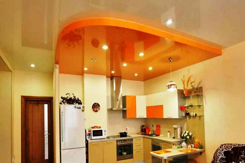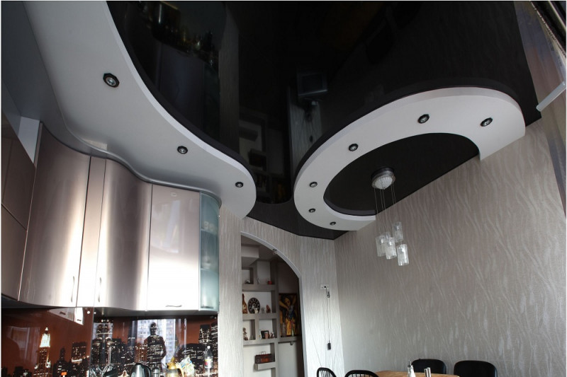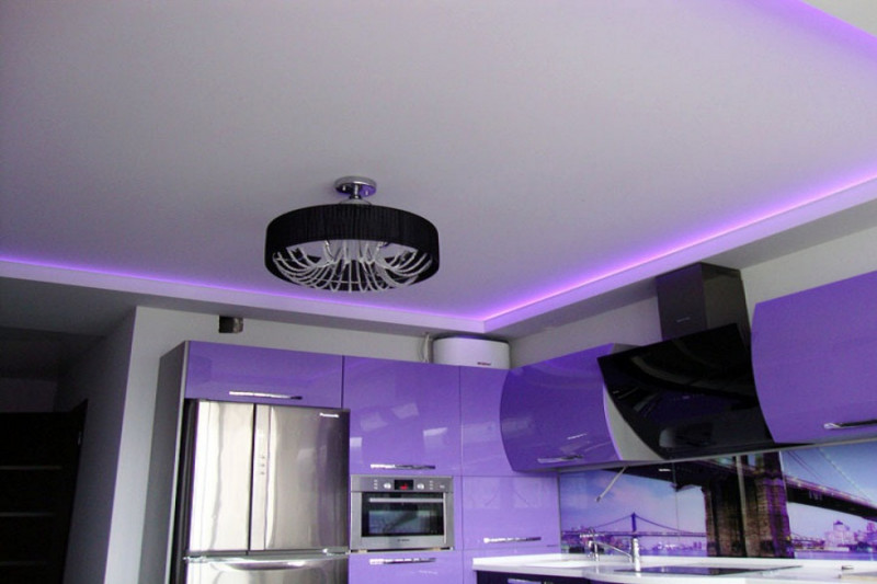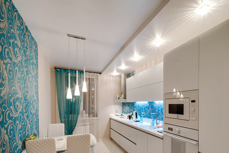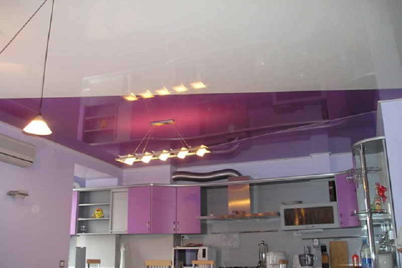 Чаще всего для кухонной зоны выбирают поливинилхлоридную пленку (ПВХ), так как она лучше всего переносит влажный воздух. Она не коптится, не боится прямого попадания воды, на случай если, вы захотите вымыть полотно или вас зальют сверху. В первом варианте используйте мягкую ткань без жесткого ворса, чтобы не поцарапать поверхность, во втором – дождитесь устранения течи и вызывайте нашего мастера. Он сольет воду, высушит тепловой пушкой полотно и вернет ему прежний вид.