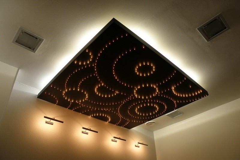 Рекомендуем посмотреть фото наших готовых работ. Среди них есть наверняка те, что вас вдохновят. Главное условие, лампа не должна нагревать полотно. В остальном выбирайте любую систему освещения.